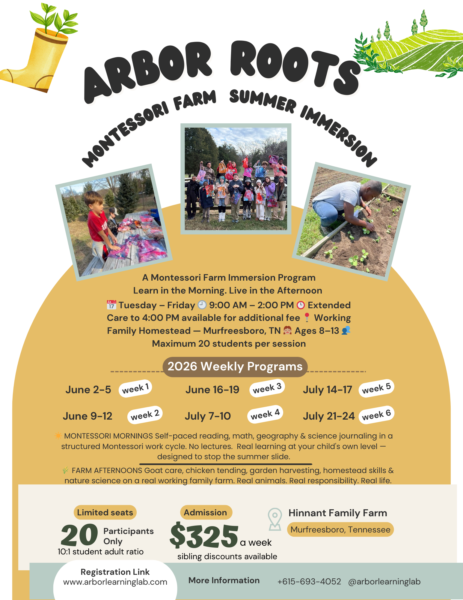 Arbor Summer Camp is a hands-and outdoor learning experience for ages 8-15 hosted at the beautiful Hinnant Family Farm in Murfreesboro. Each week blends play, creativity, and meaningful learning through agriculture, steam projects, and community-based exploration.
